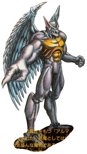 Arma, also known as Alma (アルマ Aruma) in Japan, is an antagonist from Demon's Crest. Arma was born after the war of the Crests with rare attributes. Being a relatively young demon with thriving vigor and blessed with strong wings and innate magic, he caught the eye of Phalanx, who added him as aide to his mercenary troops. Arma achieved exceptional success in a short period of time, and was soon honored by Phalanx with the position of general and regarded as one of the strongest demons in the Demon Realm, being often compared with the red demon Firebrand. Due to his high pride, he desires to confront the crimson demon.