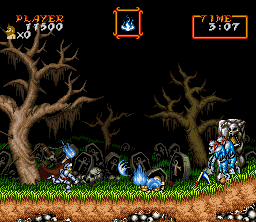 With the Golden Armor and Torch, Arthur can use the Fireball Magic (火球の魔法). It spreads four fireballs in the area surrounding his position. The fireballs move in a whirlpool-like motion.